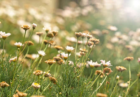Chamomile field flowers border. Beautiful nature scene with blooming medical chamomilles in sun flare. Alternative medicine Spring Daisy. Summer flowers. Beautiful meadow. Summer background