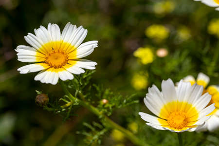 Yellow daisy with other plants. Yellow daisy on the ground. Head of Daisy flower. Spring and blossom view. Plant on the ground. Blooming in Summer.