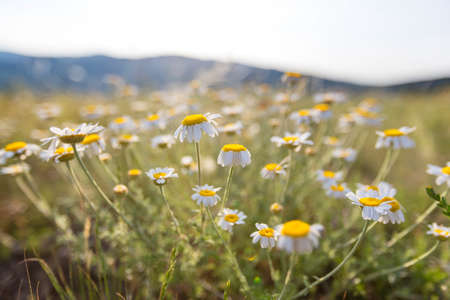 Camomile in the nature. Camomile daisy flowers field in summer day. Chamomile flowers background.