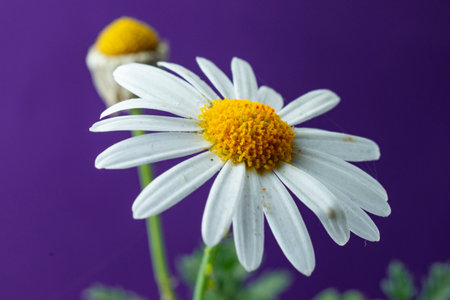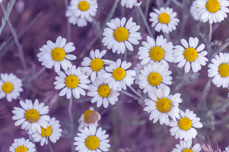 White daisies on purple background. Chamomile flower.