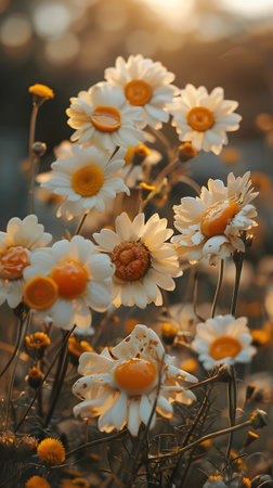 A cluster of daisies bloom in a field at sunset, creating a picturesque scene