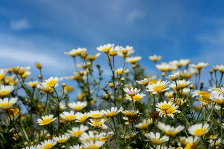 Wild Chamomile flowers growing on meadow.Natural flowers background