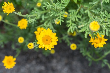 Mostly blurred Canary Island Marguerite or Dill Daisy yellow and white flowers