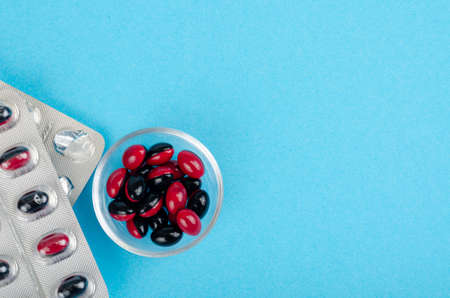 Bicolor medical pills on bright background. Studio Photo