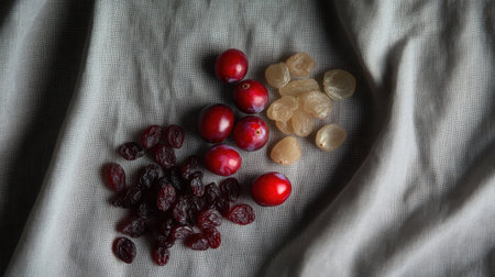 A visually appealing arrangement of fresh cranberries and dried fruits showcases natural colors and textures, perfect for a healthy snack.