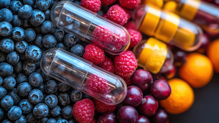 Colorful gel capsules filled tiny fruits like strawberries, blueberries, and oranges are arranged on surface, representing concept of natural vitamins in playful way