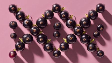 A stunning arrangement of fresh black currants creates a visually appealing display on a soft pink background, highlighting shadows and vibrant colors suitable for culinary use.