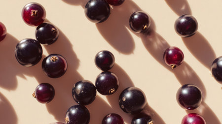 A stunning arrangement of fresh blackcurrants and redcurrants scattered on a soft beige background, showcasing their rich colors and interesting shadows. Perfect for food photography.