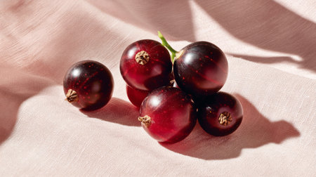 Close-up view of fresh black currants nestled on a soft pink fabric, showcasing their rich color and texture, ideal for culinary or lifestyle-themed projects.