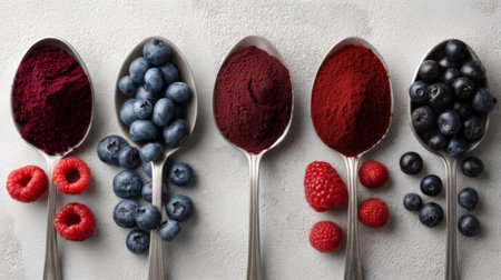 A visually appealing arrangement of silver spoons filled with vibrant natural powders and fresh berries, highlighting nutritional benefits and culinary creativity.