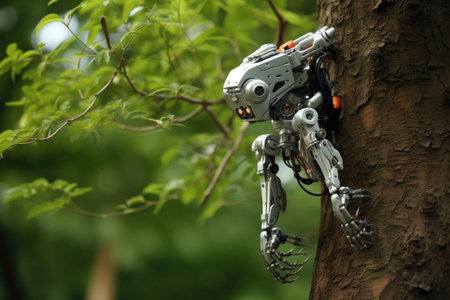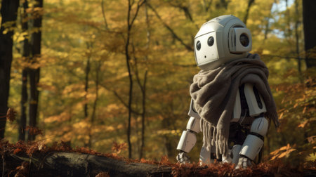 an industrial robot, adorned with a scarf, strolls through a picturesque autumn forest. this photorealistic artwork captures the essence of plush doll art, with a touch of leica m10 precision. the scene is enhanced with rtx technology, showcasing a modular and synthetism-inspired design. a unique blend of quantumpunk aesthetics adds an intriguing twist to this captivating image. ai generated