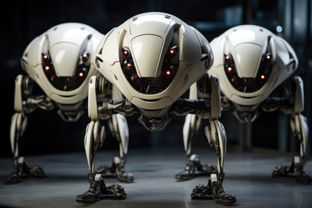 A group of humanoid robots walk in perfect synchronization beside a red wall, symbolizing technology and automation. Futuristic scene depicting advanced robotics and artificial intelligence.
