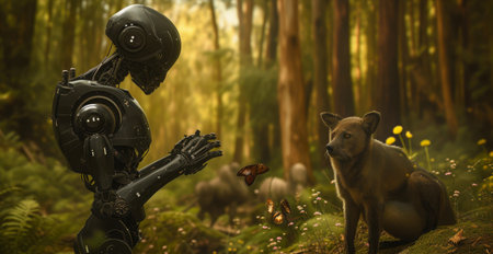 A robotic figure stands silently in a vibrant forest, covered in leaves and greenery. Sunlight filters through the trees, highlighting the fusion of technology and nature.