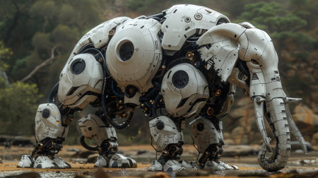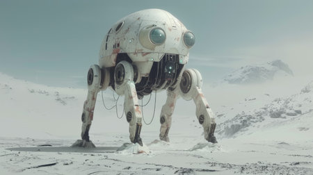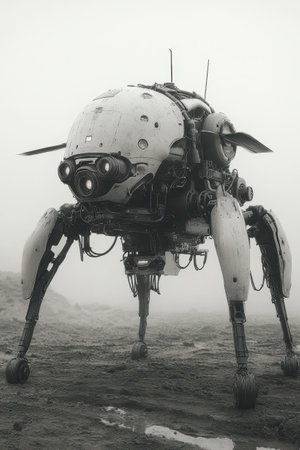A futuristic robot creature, with a round body and multiple legs, stands on a rocky and foggy landscape. The dim light highlights its advanced features, including sensors and mechanical details, suggesting a blend of artistry and technology.