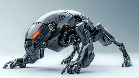 A sleek, futuristic robotic creature with a glossy black exterior, posed in a crawling position. Features include articulated limbs, glowing orange accents, and intricate mechanical details.