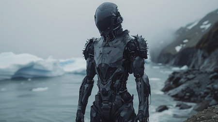 Black Armored Figure Standing in Snowy Mountain Landscape