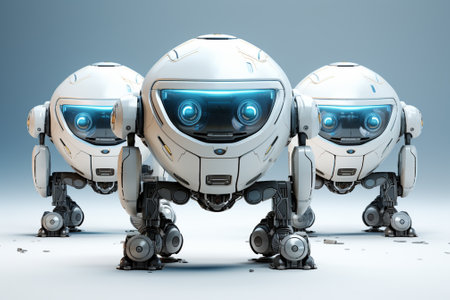 a group of robots walking down the street in a modern city of the future against a blurred background.
