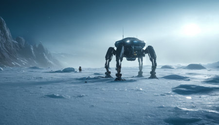 A giant robot is striding across a field covered in snow, leaving deep tracks behind.