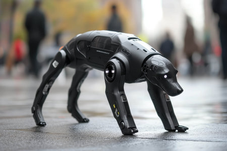 A robotic dog is seen walking on a wet city street, capturing the attention of pedestrians. Its sleek design and movement highlight innovation in robotics and artificial intelligence.