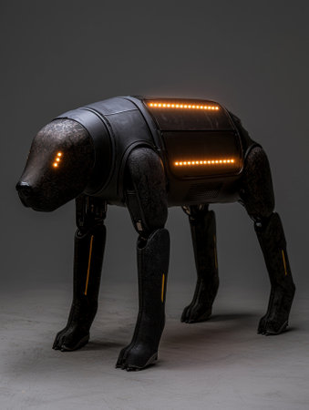 A futuristic, quadrupedal robot with a smooth, dark metallic finish and glowing orange accents, posed against a light grey backdrop, showcasing advanced engineering and design.
