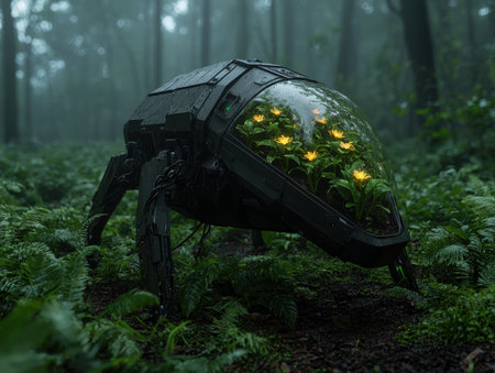 Futuristic biomechanical vehicle with plants in a misty forest.