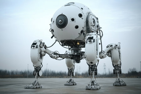 A robotic exploration unit with a rounded body and articulated limbs is situated in an industrial area.