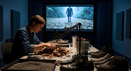 Archaeology student meticulously analyzing human skull and skeleton fragments on a workbench, researching historical data in a dimly lit forensic anthropology laboratory