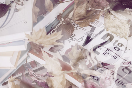 Abstract background with school mathematical textbooks, books, dry leaves. Top view. Concept of education, beginning of study, science. Blurred light style