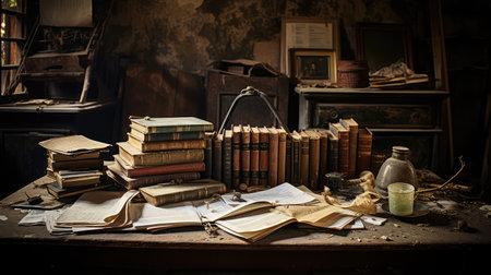 Old vintage books on dark background.