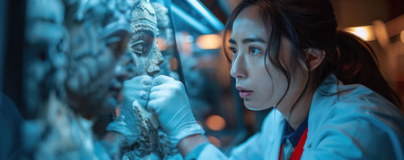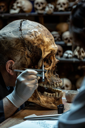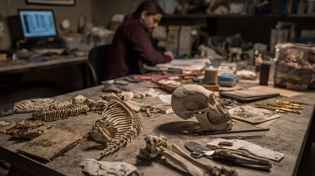 Archaeology student meticulously analyzing human skull and skeleton fragments on a workbench, researching historical data in a dimly lit forensic anthropology laboratory