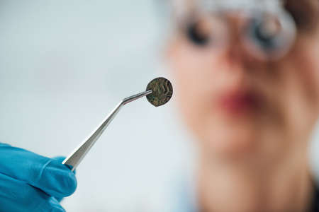 Dentist taking photo of 3d dental model on the table. Dental model with mini screw. Orthodontic dentistry. False teeth