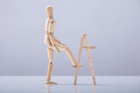 The figure of a wooden man sitting on a dark podium. The figure of a wooden man with a red leg on a light background. The concept of diseases of the lower leg