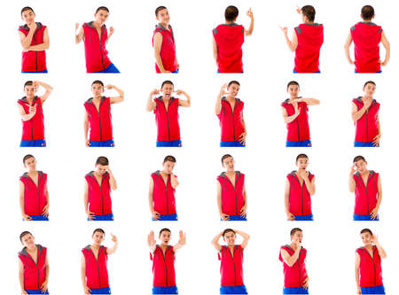 Collage with young serious man, auto mechanic or fitter in dungarees isolated over white studio background. Concept of funny meme emotions. Composite image