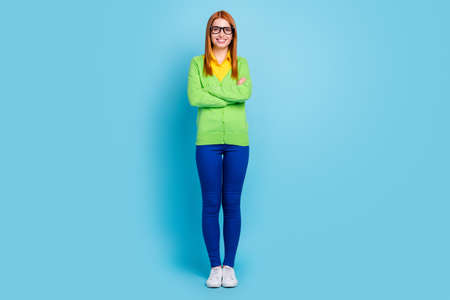 Full length body size view of attractive cheerful red-haired girl folded arms isolated over bright blue color background