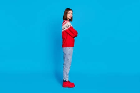 Full length body size photo woman with crossed hands in red sweater isolated bright blue color background