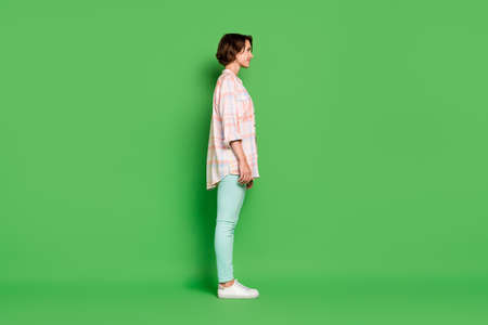 Full body profile side photo of cheerful positive charming young woman wear casual clothes isolated on green color background
