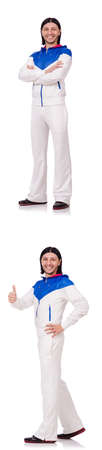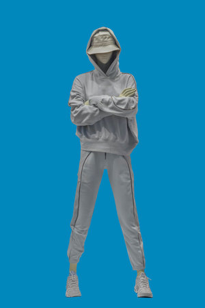 Full length image of a female display mannequin wearing gray sweatsuit isolated on blue background