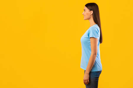 Natural Beauty. Profile portrait of beautiful casual smiling caucasian woman posing isolated over yellow studio background. Side view of lady with long hair, copy space