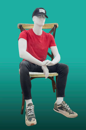 Sitting male mannequin isolated on green background. No brand names or copyright objects.