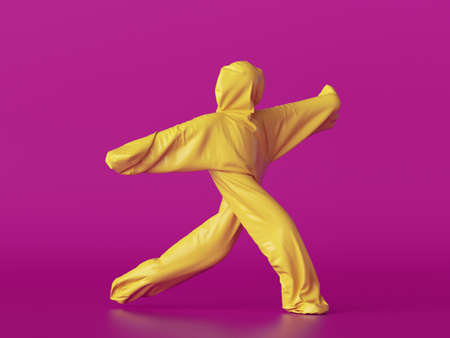 3d render, man wearing yellow halloween costume of a fortune cookie or dumpling, cartoon character walking or running. Isolated on pink background, active dancing pose. Funny mascot