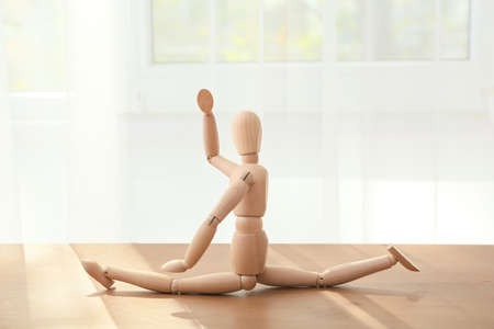 Wooden model of a man in warm sunlight. Space for your inscription. COVID-19 Pandemic Coronavirus and business concept. Copy space.
