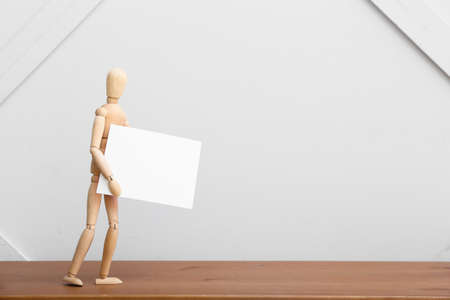 A wooden mannequin Standing on a grey table. Wooden Drawing Doll with Empty Space.