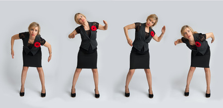 A series of images showing a woman in various casual poses. She is wearing a maroon top and blue jeans.