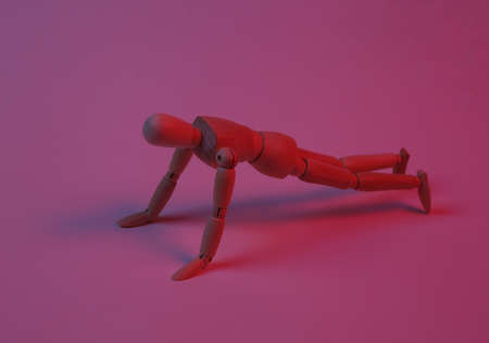 Wooden puppet practices push ups in red blue background. healthy lifestyle concept