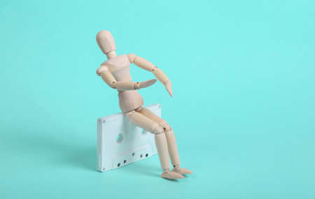 The figure of a wooden man with an outstretched arm on a blue background. The figure of a wooden man on a colored background of copy space