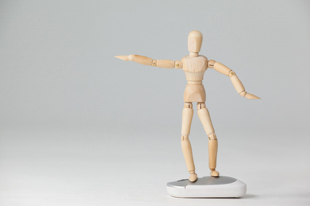 Dynamic pose of a wood artist's model mannequin, headed towards the light. Shot over flat dark grey background.