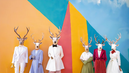 Surreal and imaginative digital depicting animals with human like fashion and expressions The creatures are dressed in various costumes masks and accessories