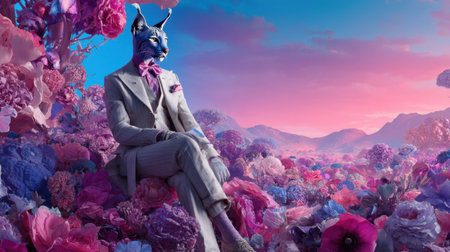 This surreal artwork features an elegant anthropomorphic character with a cat head, dressed in a stylish suit, amidst a colorful floral landscape.