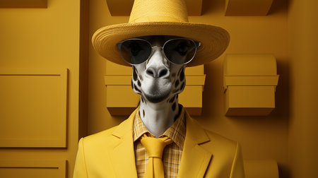 a giraffe wearing a vibrant suit, mask, and sunglasses is captured in a breakdance-inspired photograph. the image showcases a combination of dark orange and light beige tones, with a dynamic balance of mixed patterns. created by artists mike campau and walt kelly, the photo exudes explosive pigmentation. ai generated