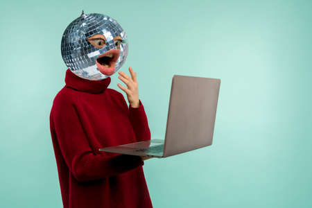 Abstract modern collage. woman with a mirrored disco ball instead of a head with eyes and mouth in sweater looking laptop computer screen over blue background